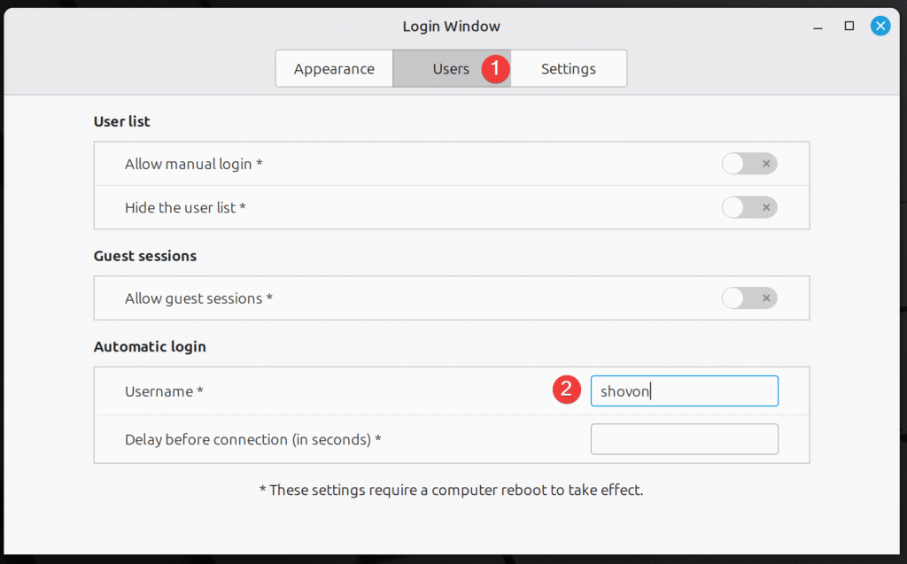 The Login Window app should be opened. Navigate to the Users tab[1] and type in your login username in the Automatic login > Username section[2].