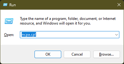 First, press Windows + R to open Run window, type in ncpa.cpl, and press Enter.