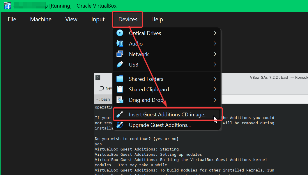 To insert the VirtualBox Guest Additions CD image to the VirtualBox Virtual Machine (VM), click on Devices > Insert Guest Additions CD image….