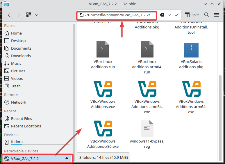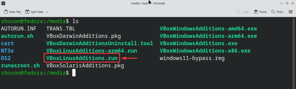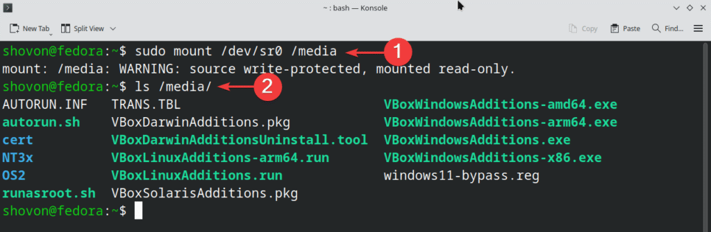 If you’re having issues mounting the VirtualBox Guest Additions CD image from the Fedora 43 graphical user interface, you can also do it from the command-line.