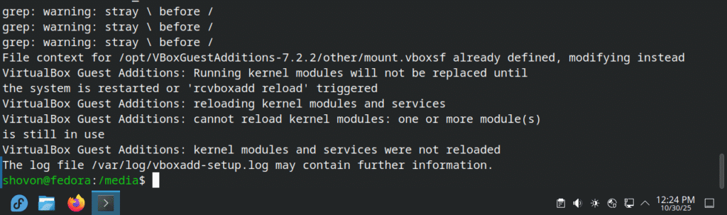 For the changes to take effect, reboot your Fedora 43 VirtualBox VM.